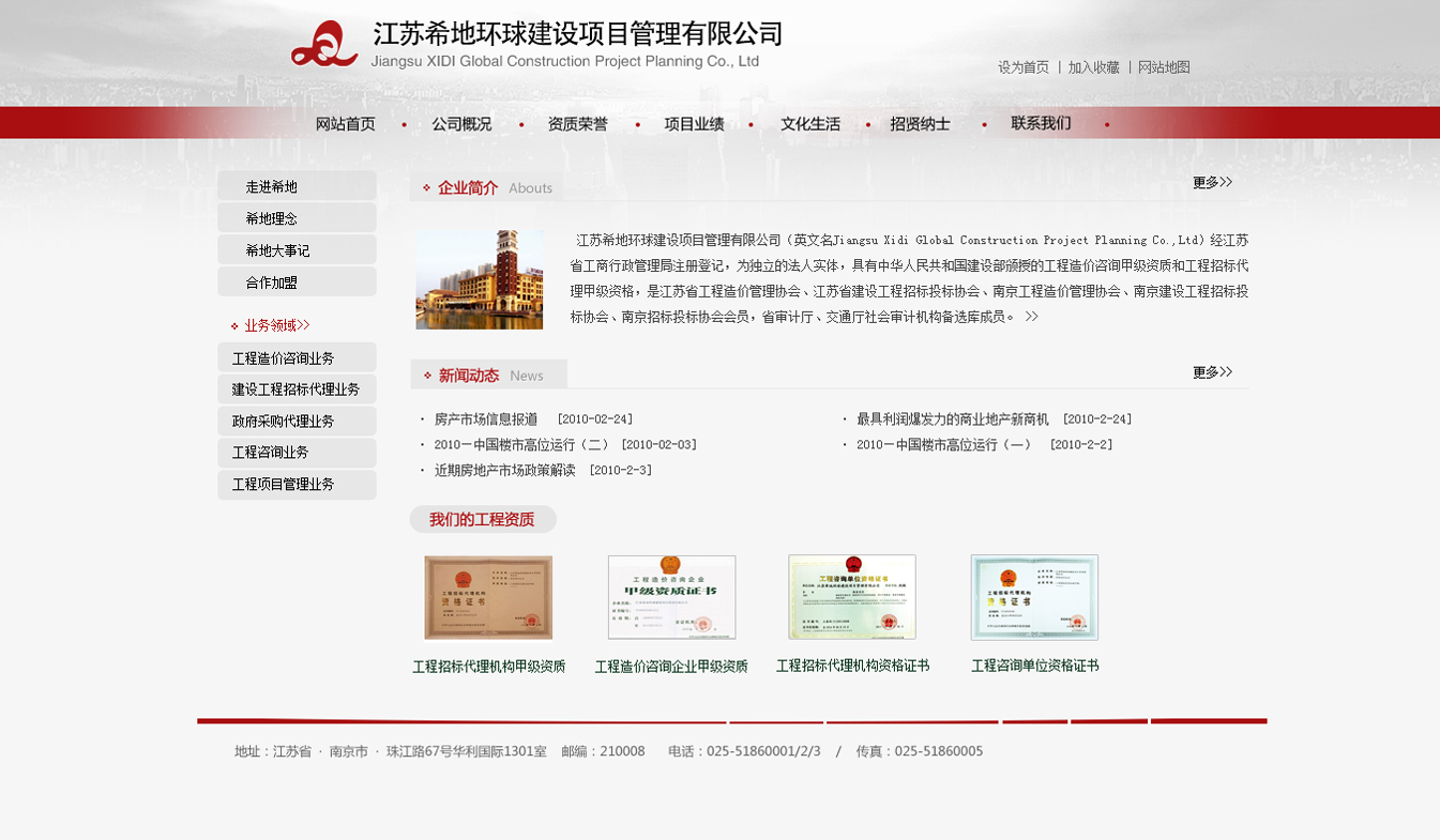 江苏希地环球建设项目管理有限公司(英文名Jiangsu Xidi Global Construction Project Planning Co.,Ltd)经江苏省工商行政管理局注册登记,为独立的法人实体,具有中华人民共和国建设部颁授的工程造价咨询甲级资质和工程招标代理甲级资格,是江苏省工程造价管理协会、江苏省建设工程招标投标协会、南京工程造价管理协会、南京建设工程招标投标协会、南京招标投标协会会员,省审计厅、交通厅社会审计机构备选库成员。公司主营工程项目管理、招标代理、造价审计、投资策划、销售代理、司法鉴定等咨询服务业务。